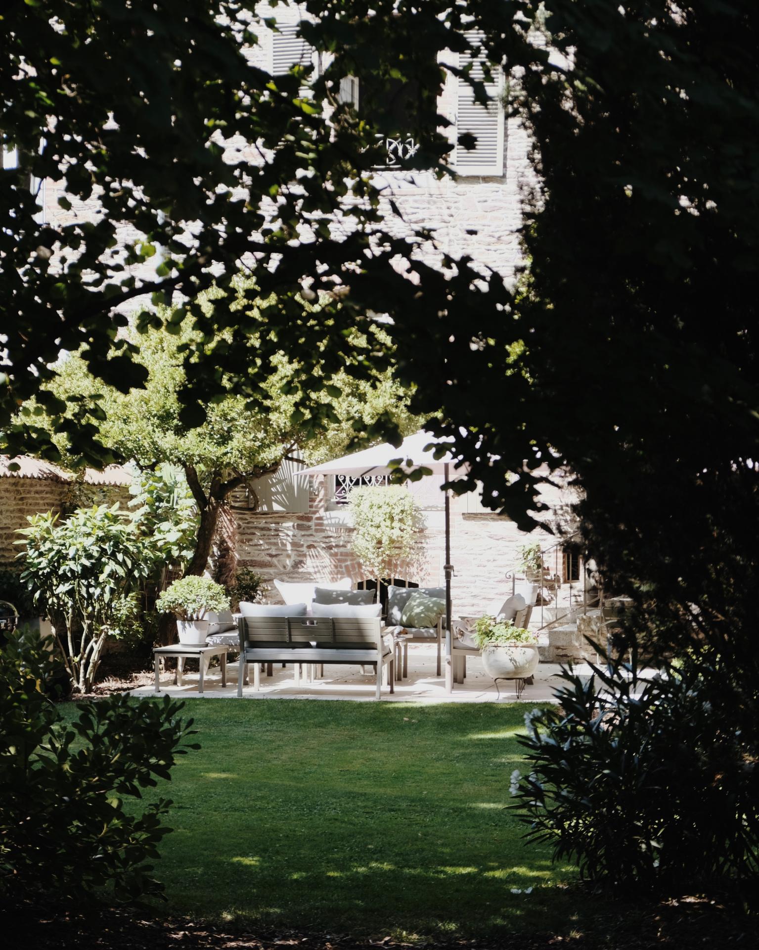 Une grande terrasse abritée sous la glycine pour profiter de la vie .